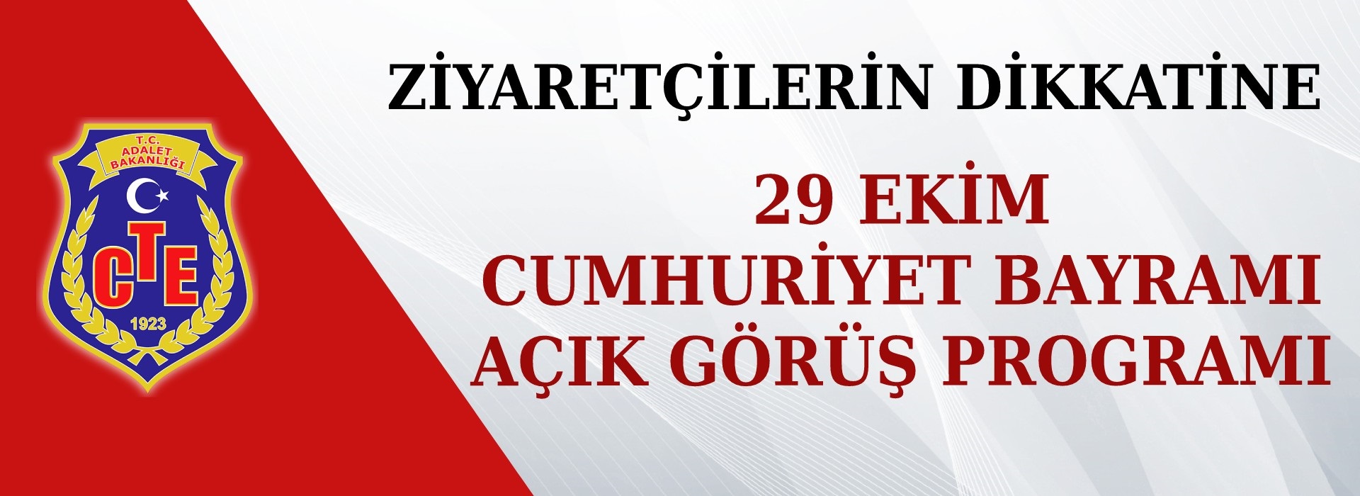 Hükümlü ve Tutuklıların Ziyaret Edilmeleri Hakkında Yönetmelik'in İkinci Bölüm "Bayramlarda ve özel günlerde açık görüş" alt başlıklı 15 inci maddesi gereğince yapılacak olan 29 Ekim Cumhuriyet Bayramı Açık Görüşü, 27,28,30 ve 31 Ekim 2025 tarihlerinde yapılacaktır.
